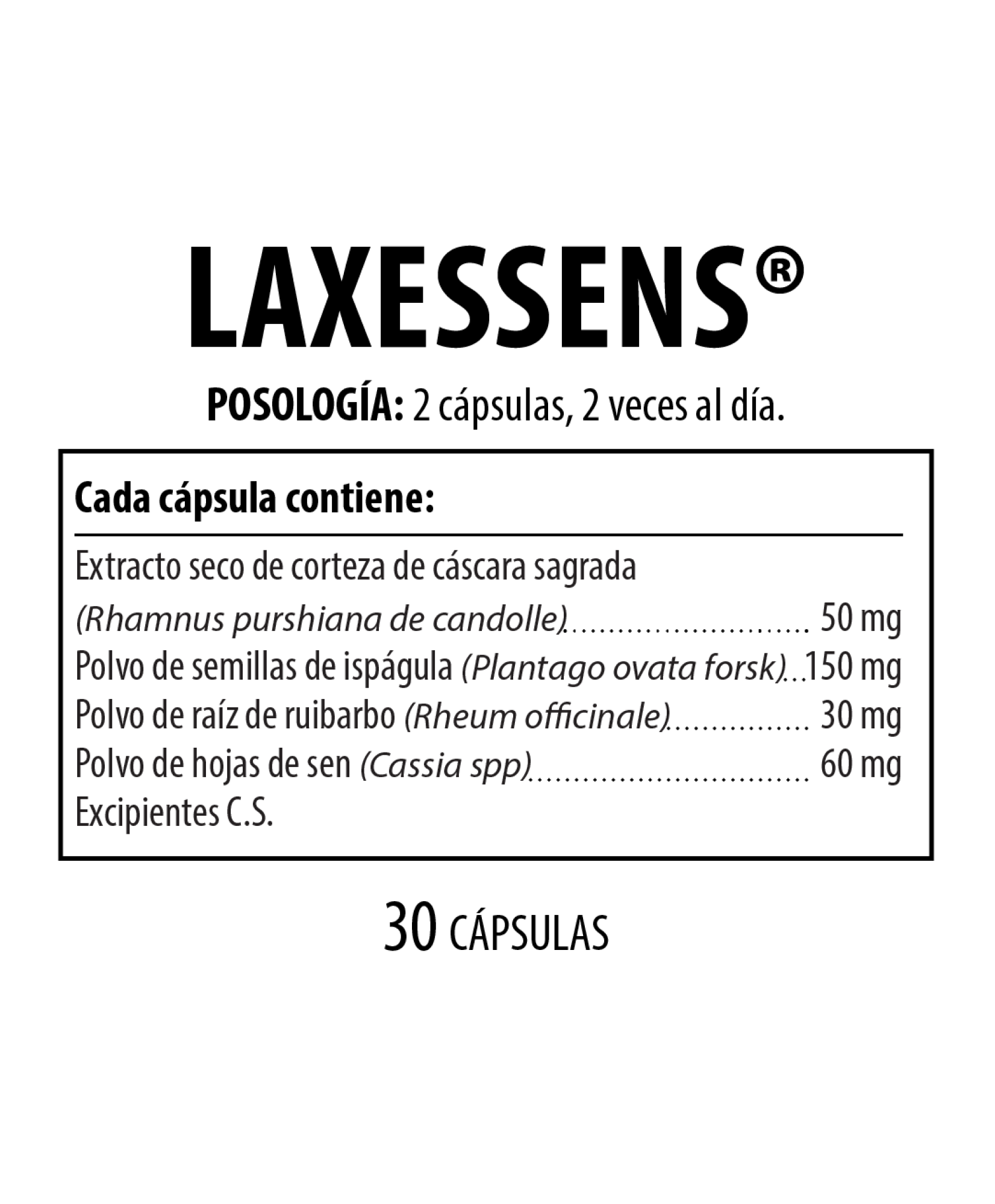 Extracto cáscara sagrada (Rhamnus purshiana de candolle), Polvo de ispágula (Plantago ovata forsk), Polvo de ruibarbo (Rheum officinale) y Polvo de sen (Cassia spp).